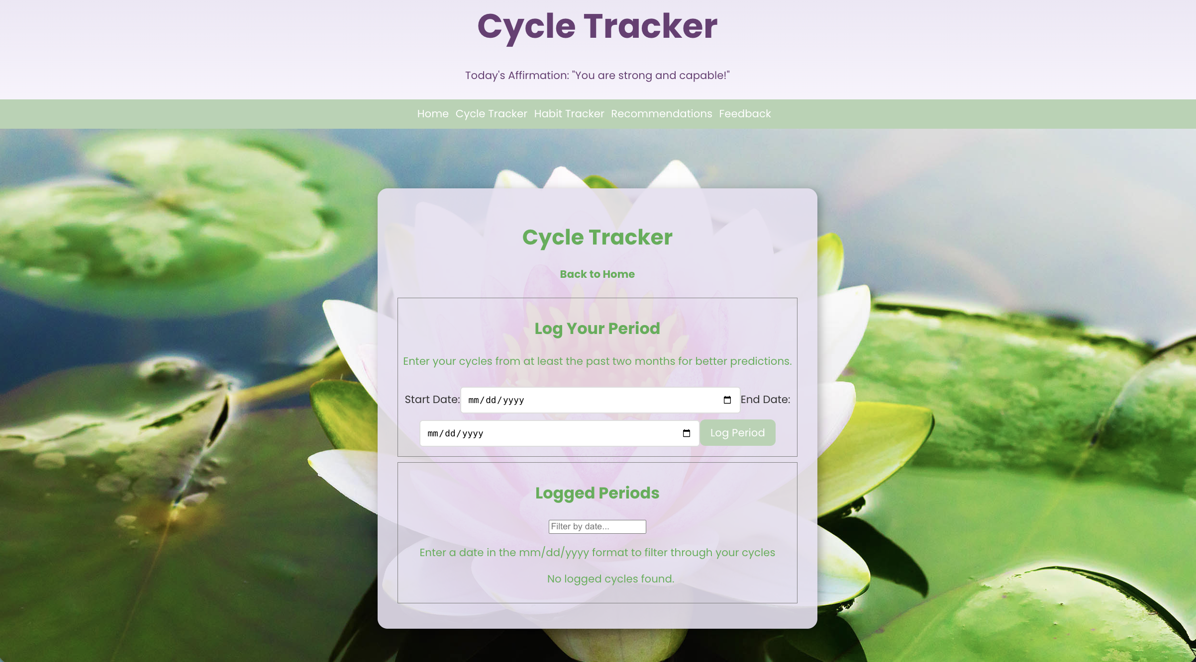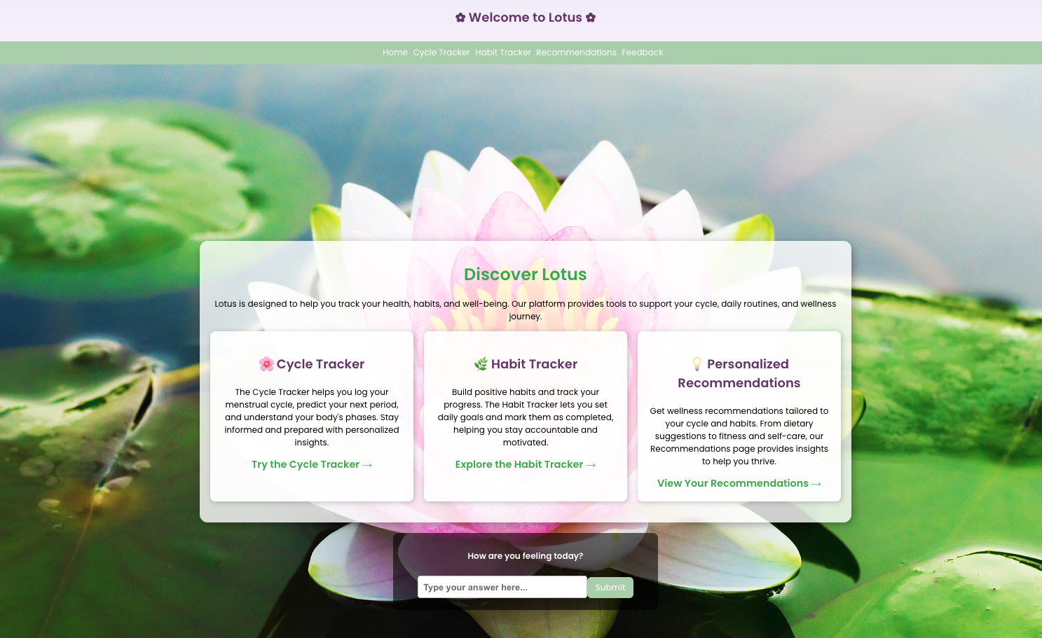 Lotus is a menstrual health web application designed to help users understand how their menstrual cycle impacts symptoms, diet, and overall well-being. While most period tracking apps focus on prediction and logging, Lotus translates user data into personalized, actionable recommendations based on habits and cycle.