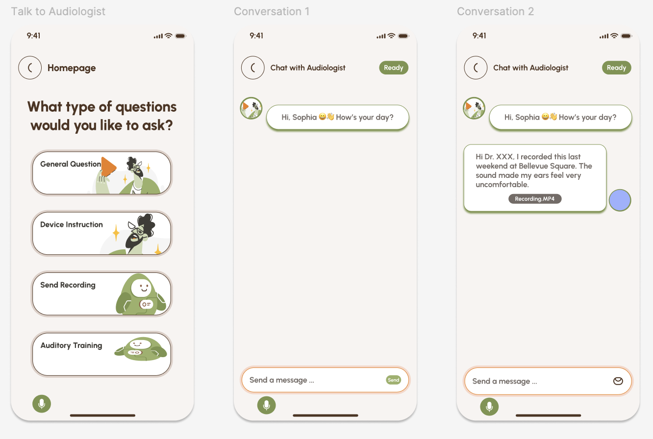 These interviews directly influenced our product direction and feature prioritization. The audiologists emphasized the need for tools that allow users to record environmental sound to help diagnose device and listening issues. They also emphasized simple navigation, ease of communication, and the ability to personalize the number of features available on the application due to varying levels of technical literacy. Users also reported friction during transitions between hearing aid brands due to differences in companion app design and functionality.