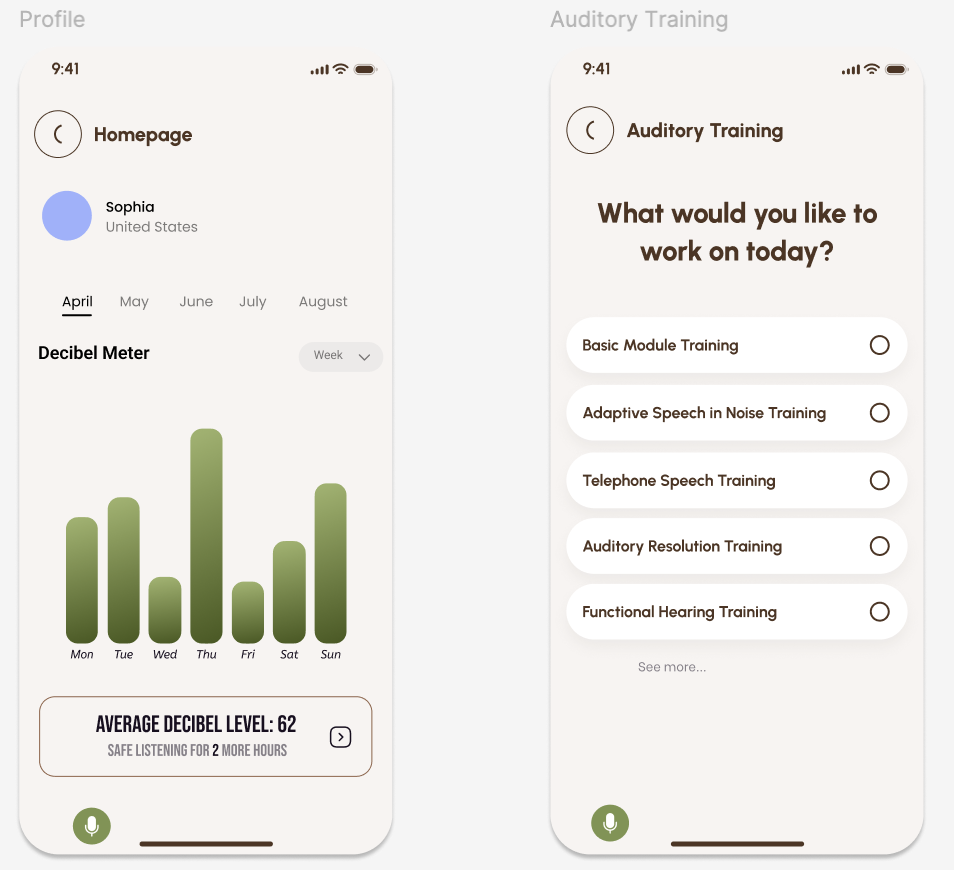 User feedback directly informed design changes. For example, we expanded the “Talk to Audiologist” feature to allow users to select different types of auditory training, improving personalization and usability. We also improved the profile and progress visualization experience, adding histogram-based decibel tracking and time-based filtering to help users better understand their hearing environment over time. These iterations reinforced the importance of designing for clarity, accessibility, and user control in assistive technology applications.