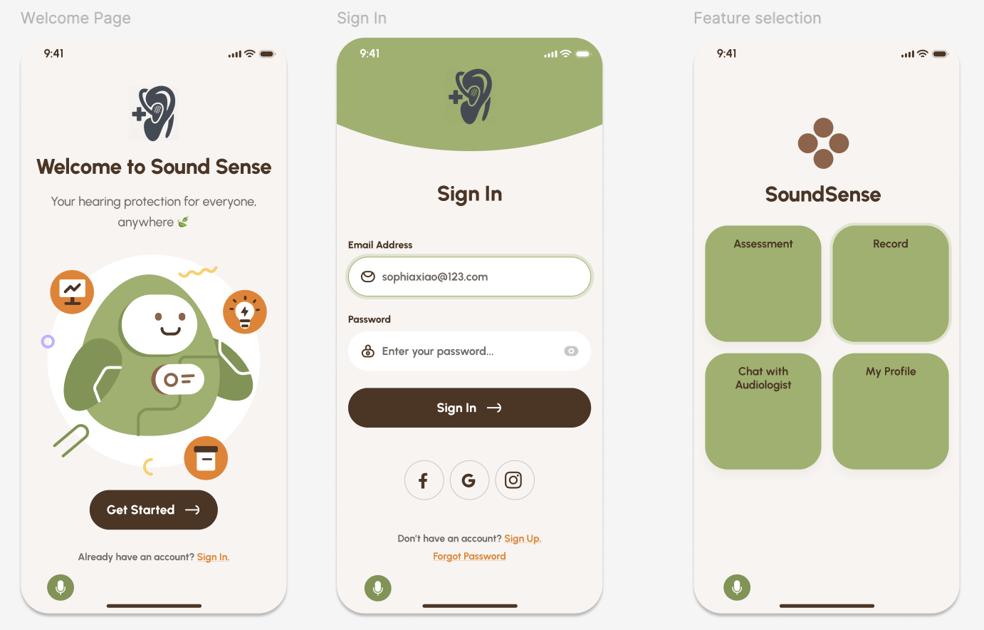 SoundSense is a mobile companion app designed to help hearing aid users better understand, personalize, and manage their hearing experience. The app bridges the gap between users, audiologists, and hearing technology by providing real-time environmental sound recording, personalization controls, and accessibility-centered interaction features.